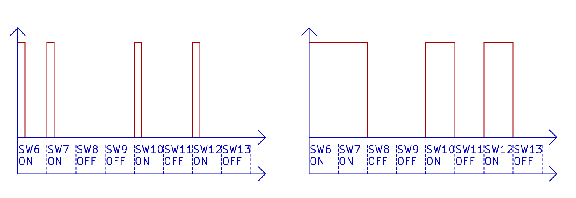 Grâce à un interrupteur situé en façade (sur schéma : SW4), il est possible de fonctionner non pas avec des impulsions, mais avec un seuil continu fixé à 10 volts. Le chronogramme ci-dessous permet de differencier les deux modes.