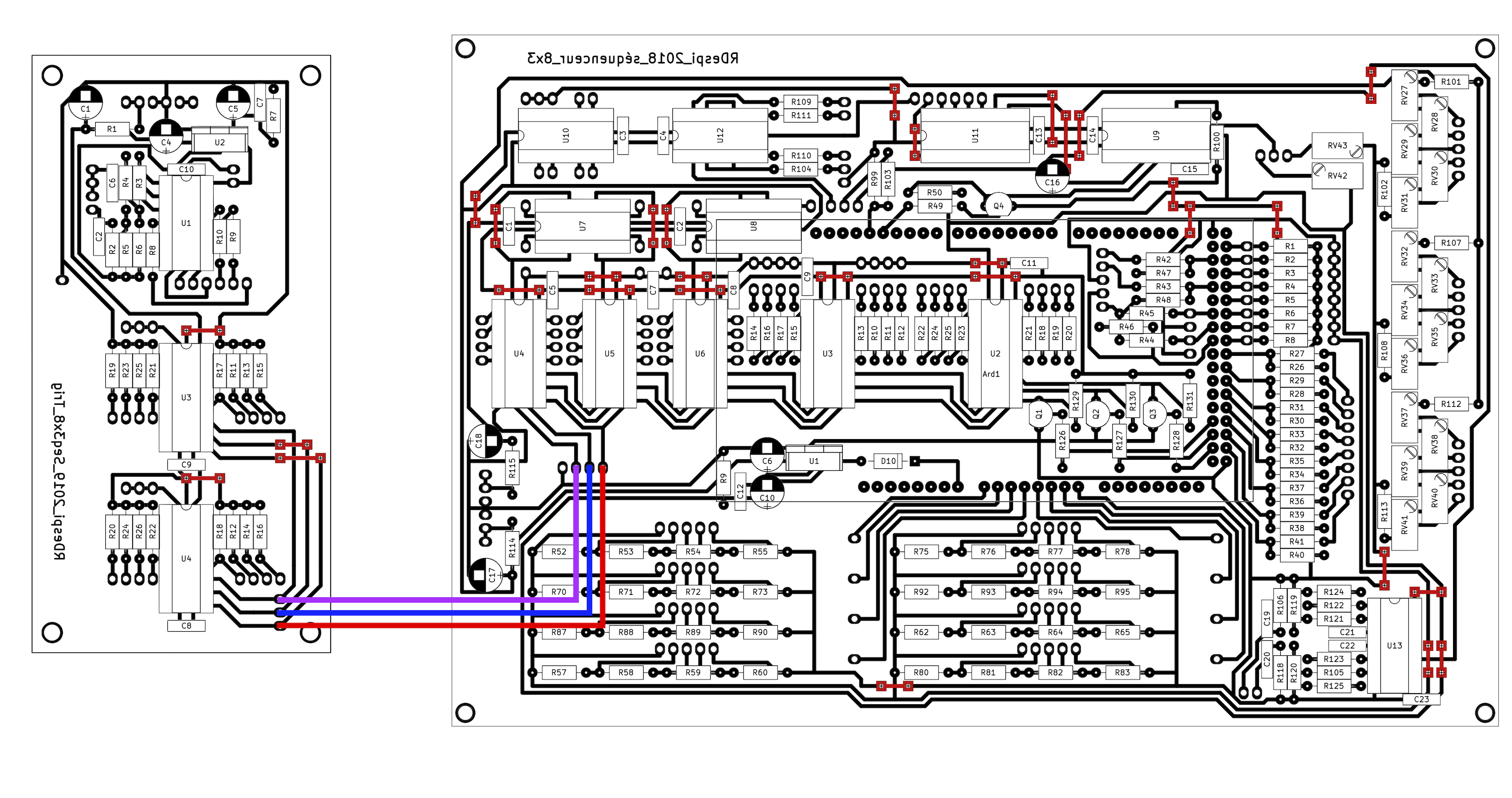 - Couplé avec un séquenceur 8x3, pour chaque pas d'une séquence : impulsion sur A ou B ou sur aucun des deux (avec leviers)
