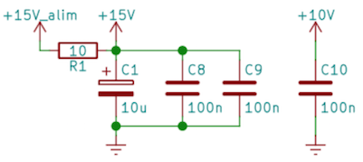 Il y a aussi présence des traditionnels condensateurs de découplages situés entre les bornes d'alimentation des circuits intégrés présents sur le PCB et de la résistance protégeant l'amont de l'alimentation en cas de surintensité.