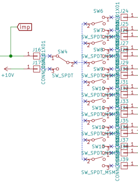 Le signal en sortie de SW4 (suite d'impulsions ou tension continue de 10 volts) est ensuite distribué sur huit interrupteurs. Cela correspond au nombre de pas d'une séquence du séquenceur 8x3. Ces interrupteurs possèdent trois positions : la première distribue le signal sur une entrée du premier multiplexeur, la deuxième distribue le signal sur le deuxième multiplexeur et la troisième ne distribue pas du tout le signal.