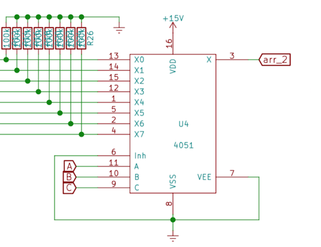 Comme dans le séquenceur 3x8, on utilise des multiplexeurs pour lire une à une les tensions disponibles sur les huit interrupteurs. Le fonctionnement du multiplexeur est le même que celui des CD4051 propres au séquenceur, car les broches de contrôle sont connectées entres-elles. Cela assure donc un fonctionnement optimal lorsque les deux modules sont en mode couplé. Chacune des entrées est mise à la masse au travers d'une résistance de 100 kOhms pour éviter un fonctionnement chaotique du module.