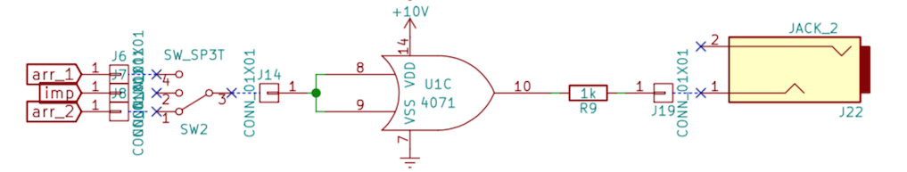Le module possède trois sorties qui sont "isolées" entres elles par le biais d'une porte logique "ou" propre à chacune d'elles. Il est possible pour chaque sortie de lire soit la sortie du premier multiplexeur, soit la sortie du deuxième ou alors de lire toutes les impulsions (à utiliser si on veut un convertisseur Gate / Trig).
