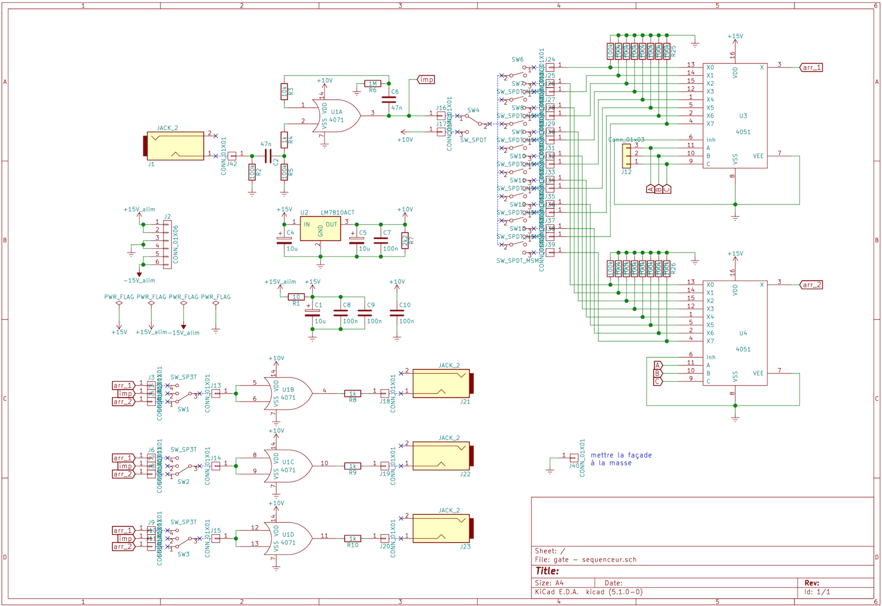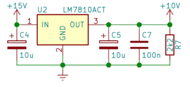 Ici on utilise une alimentation externe de type symétrique en 15 volts (+15V / GND / -15V), car le module a été créé pour être utilisé au sein d'un synthétiseur modulaire YuSynth. Pour avoir les dix volts nécessaires pour la création d'un signal de Gate, j'ai tout simplement utilisé un régulateur de tension de dix volts en lui associant ses propres condensateurs de découplage et une résistance assurant toujours une consommation minimale de courant.