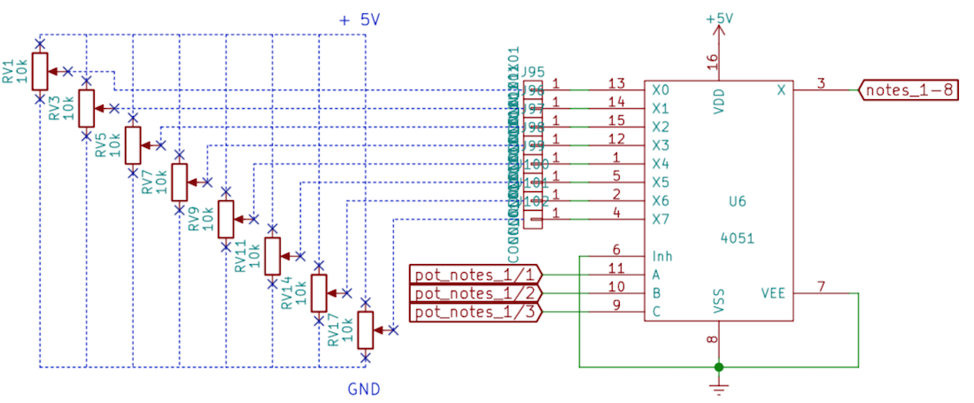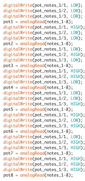 Afin de pouvoir gérer tous les potentiomètres, j'ai dû utiliser une technique pour disposer de plus d'entrées analogiques sur mon Arduino, car celle-ci n'en possédant que 16 je pouvais certes gérer tous les potentiomètres liées aux réglages des notes sur chaque pas, mais je n'aurai pas pu ajouter d'autres potentiomètres. J'ai donc utilisé des multiplexeurs, plus précisément des CD4051, qui fonctionnent comme des sélecteurs contrôlés sur trois pins par des informations de type numérique (0 ou 1). Cela me permettait de connecter 8 potentiomètres sur un circuit intégré et grâce à trois sorties numériques de l'Arduino, de sélectionner l'entrée du multiplexeur à lire sur une entrée analogique de ma carte. Pour lire les valeurs des tensions sur les 8 potentiomètres, il suffit de créer un algorithme envoyant d'abord au multiplexeur, sur ses 3 pins de contrôle, les valeurs nécessaires pour sélectionner la première entrée, puis de lire la tension à la sortie du multiplexeur (ce qui équivaut à la tension délivrée par le premier potentiomètre), puis d'envoyer les valeurs nécessaires pour lire la deuxième entrée et ainsi de suite (comme le montre le schéma et le code Arduino ci dessous).