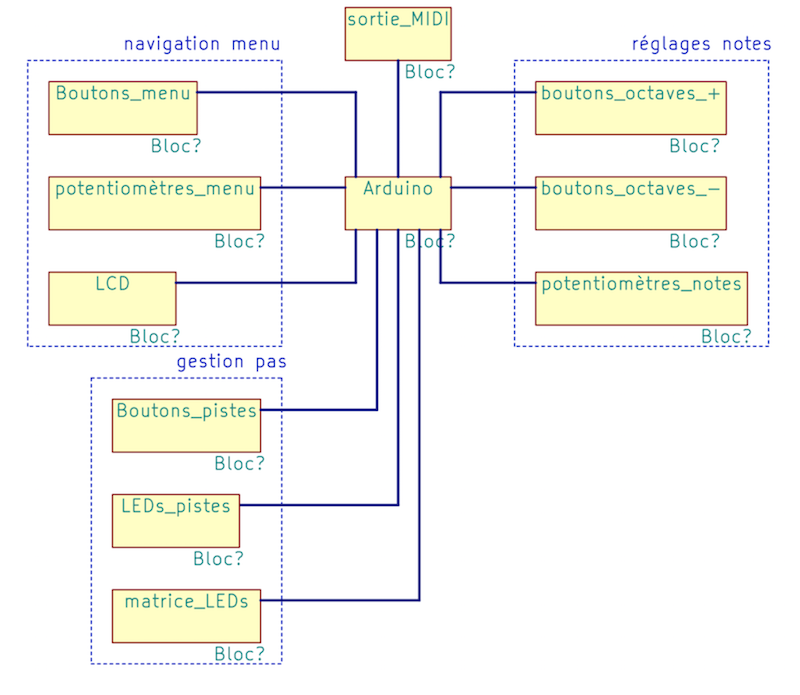 Le séquenceur, comme on peut le voir sur le schéma explicatif ci contre, est composé de 6 parties principales qui sont les suivantes : boutons pour octaves, potentiomètres pour notes, LCD et boutons + potentiomètres pour navigation dans les menus, matrice à leds, sortie MIDI, interface Arduino. Le schéma permet aussi de visualiser les différentes connexions entre ces parties.