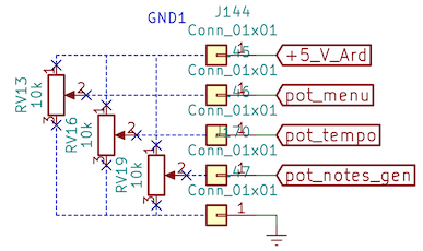 Pour lire les tensions des deux autres potentiomètres j'ai utilisé un simple montage diviseur de tension avec lecture de la tension délivrée, sur une entrée analogique de l'Arduino.