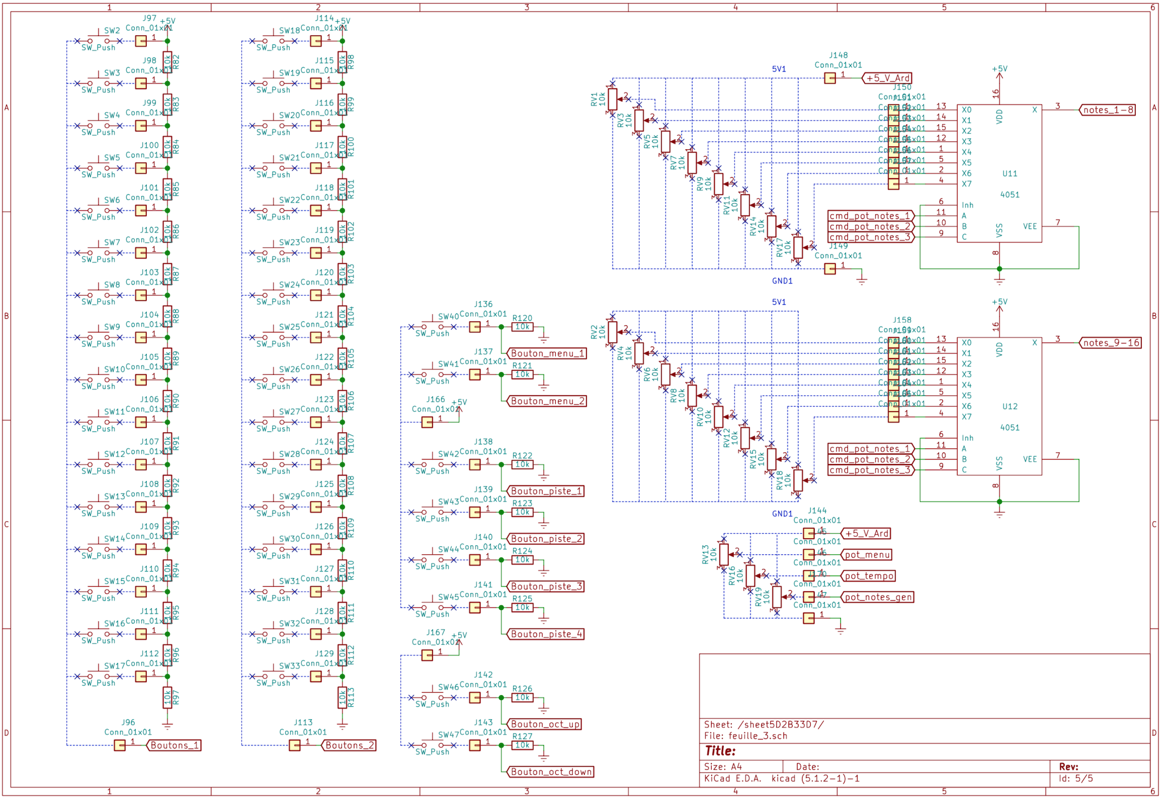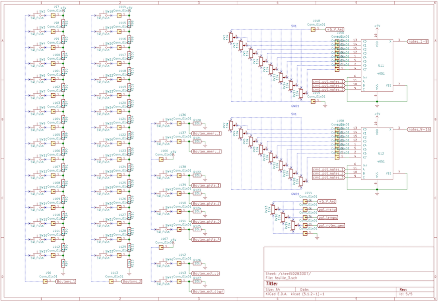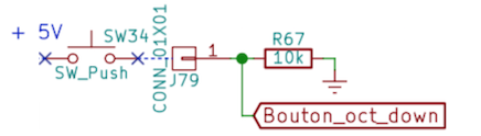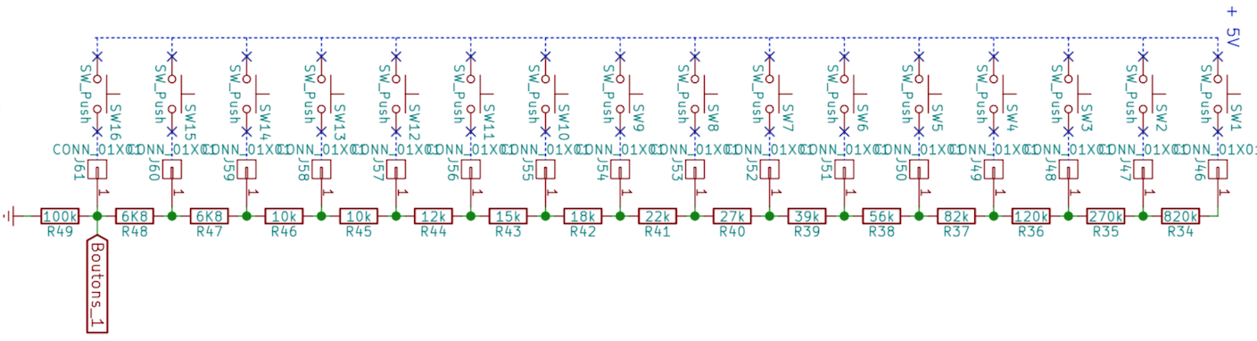 Les boutons servant à régler l'octave de chaque note, tout comme les autres boutons, sont connectés à la masse mais aussi au 5 volt (avec résistance !) comme le montrent les schémas ci dessous, ce qui permet à l'Arduino de lire soit un 0 (bouton non appuyé) soit un 1 (bouton appuyé) lorsque l'on utilise une entrée numérique de la carte. La différence dans les connexions des boutons servant à régler l'octave de chaque note est l'utilisation d'une échelle de résistances (pont diviseur de tensions muliples). En effet je ne possédais pas assez de ports numériques sur l'Arduino méga pour pouvoir tout gérer, j'ai donc dû utiliser cette technique pour me permettre d'utiliser mes seize boutons tout en ne monopolisant qu'une seule entrée analogique de l'Arduino. Les valeurs des résistances sont définies pour avoir des écarts de tension les plus grands et constants possibles.