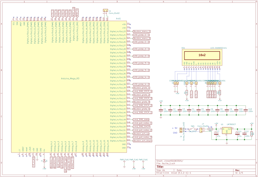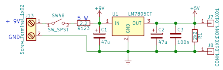 Le séquenceur s'alimente via un cordon avec transformateur intégré délivrant du neuf volts en continu. On place un interrupteur entre cette entrée et le reste du montage (la résistance pouvant dissiper 5W sert à protéger l'interrupteur), puis on vient alimenter notre carte Arduino sans oublier de placer la diode de protection. On récupère aussi cette tension de neuf volts pour en obtenir une de cinq volts grâce au montage ci contre (à base de 7805).