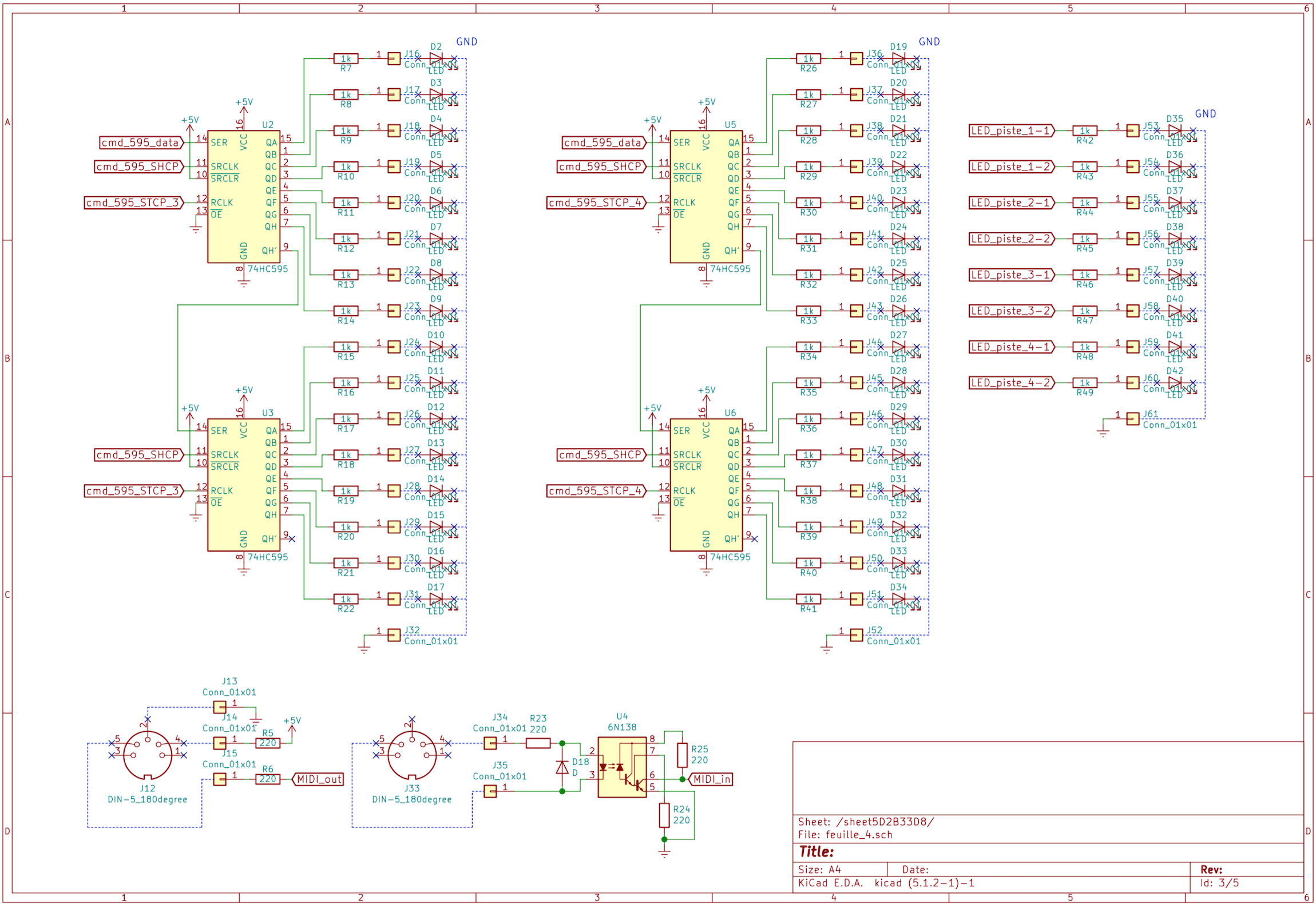 C'est bien beau d'avoir un séquenceur fonctionnel, mais si celui-ci ne peut pas transmettre ses données MIDI aux instruments, je n'en voit pas l'utilité ... J'ai donc connecté à mon Arduino un montage me permettant d'envoyer à partir des informations collectées (sur les potentiomètres, boutons ...) des informations sur une prise DIN (utilisée pour transmettre les signaux MIDI dans notre cas). Le montage que j'ai utilisé est donné sur la chaine "Notes and Volts" dans cette vidéo.