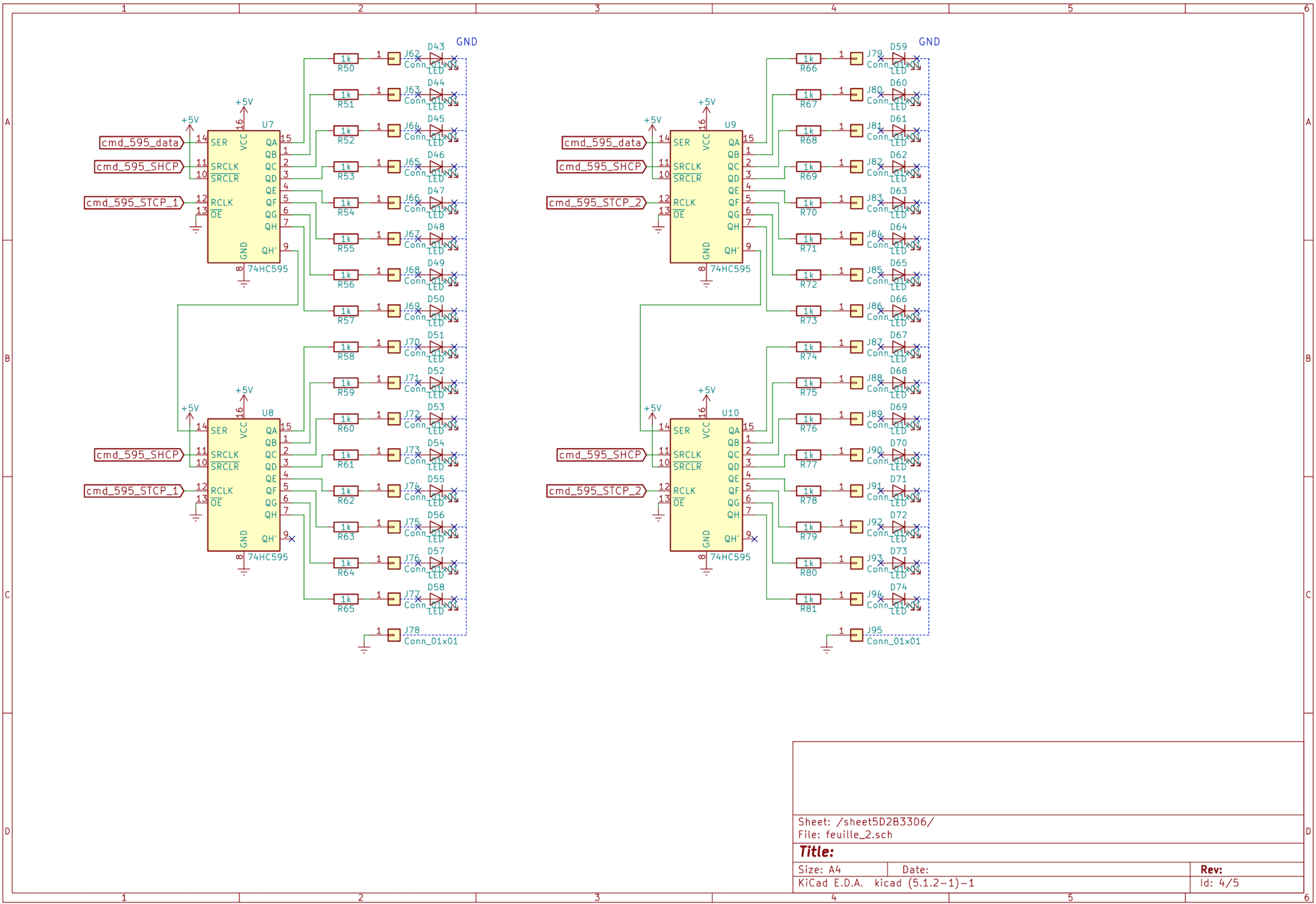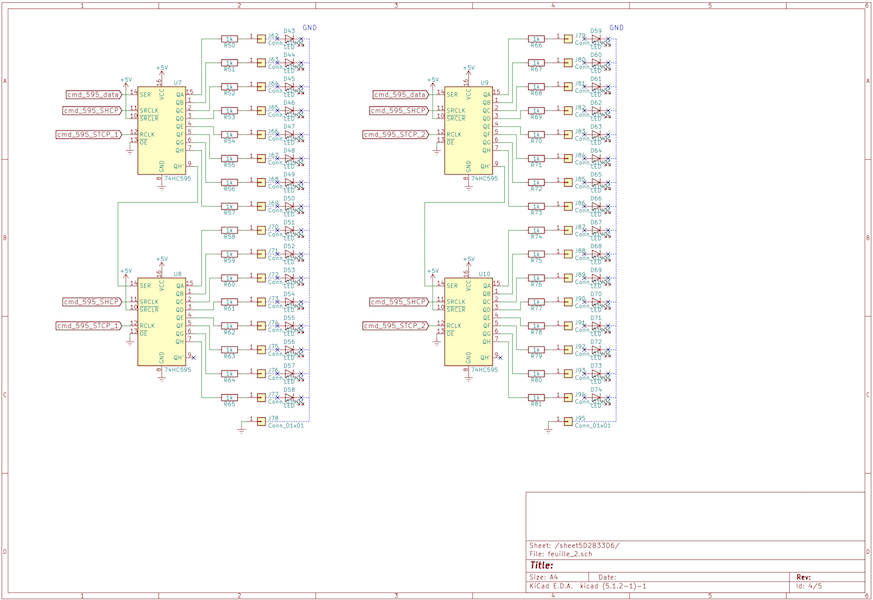 La matrice lumineuse possède les dimensions suivantes : 16 x 4 leds. Le fonctionnement est assez simple, chaque led d'une ligne de 16 est reliée sur une sortie d'un registre à décalage (74HC595), ceux-ci ne possédant que 8 sorties, j'en utilise deux par ligne, mais connectés en cascade ce qui n'utilise que trois sorties numériques sur l'Arduino par ligne de leds (données, verrou, horloge).