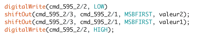 On met déjà le verrou au niveau bas, puis on transmet nos données pour piloter les leds et on remet le verrou en position haut. "MSBFIRST" est le sens de l'envoi des informations, si vous voulez changer ce sens vous pouvez saisir à la place "LSBFIRST". Les variables "valeur1" et "valeur2" sont des nombres compris entre 0 et 255, la première instruction "shiftOut" permet d'envoyer les informations au deuxième registre et la deuxième au premier. En fait les information de la première ligne sont bien envoyées au premier registre mais comme juste après on renvoie une autre ligne d'informations, la première est "poussée" vers le deuxième regitre. Si on veut afficher une seule LED à la fois on donnera à nos variables des valeurs multiples de deux (conversion binaire), tout en pensant à mettre une des deux variables à zéro quand l'autre en est différente.