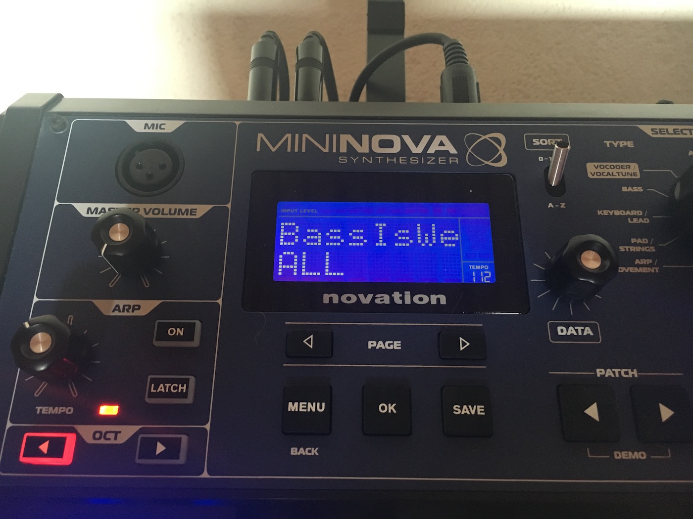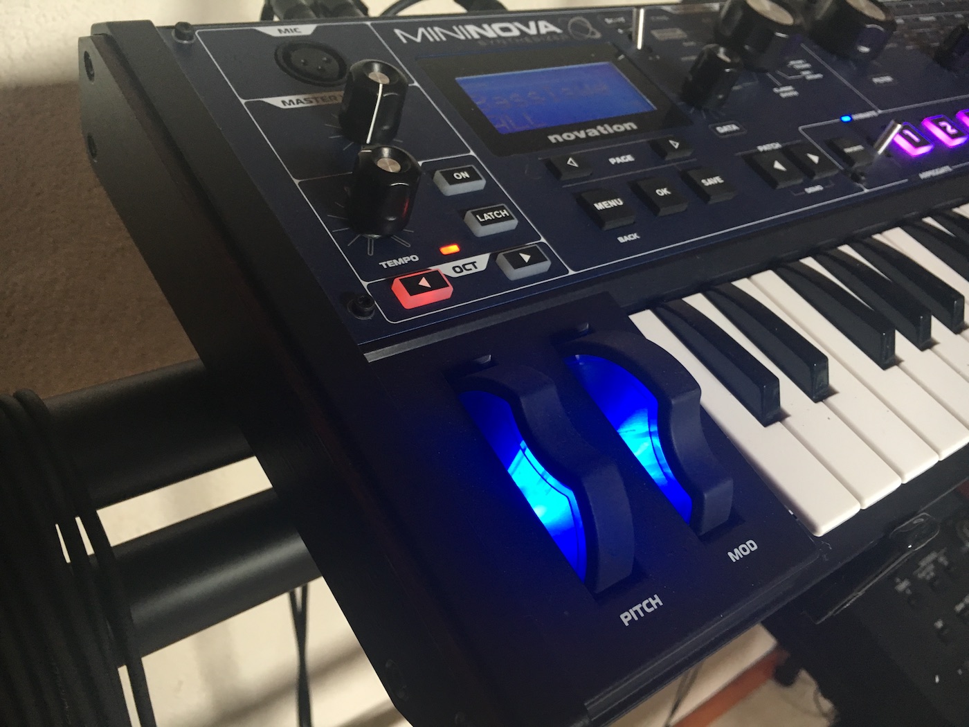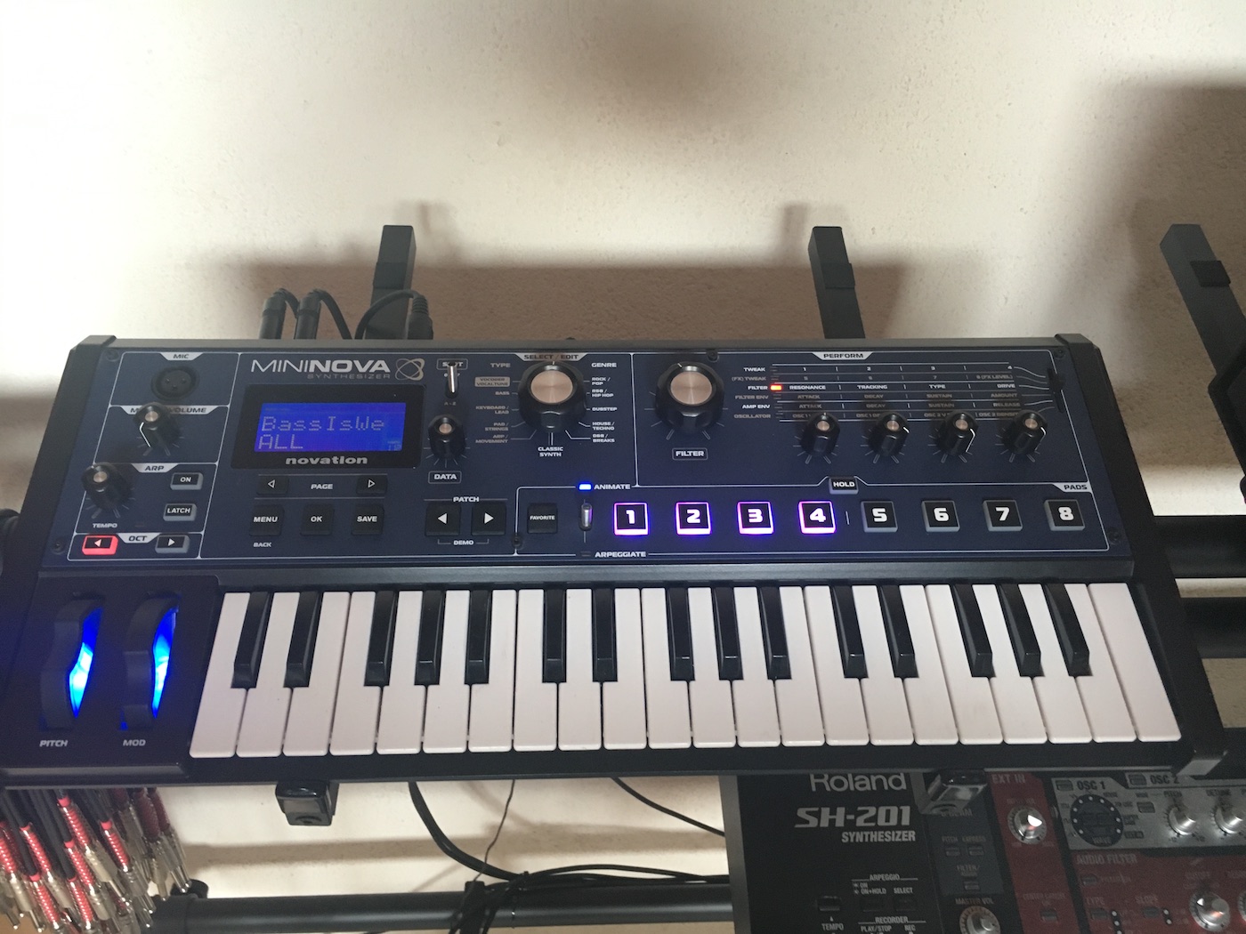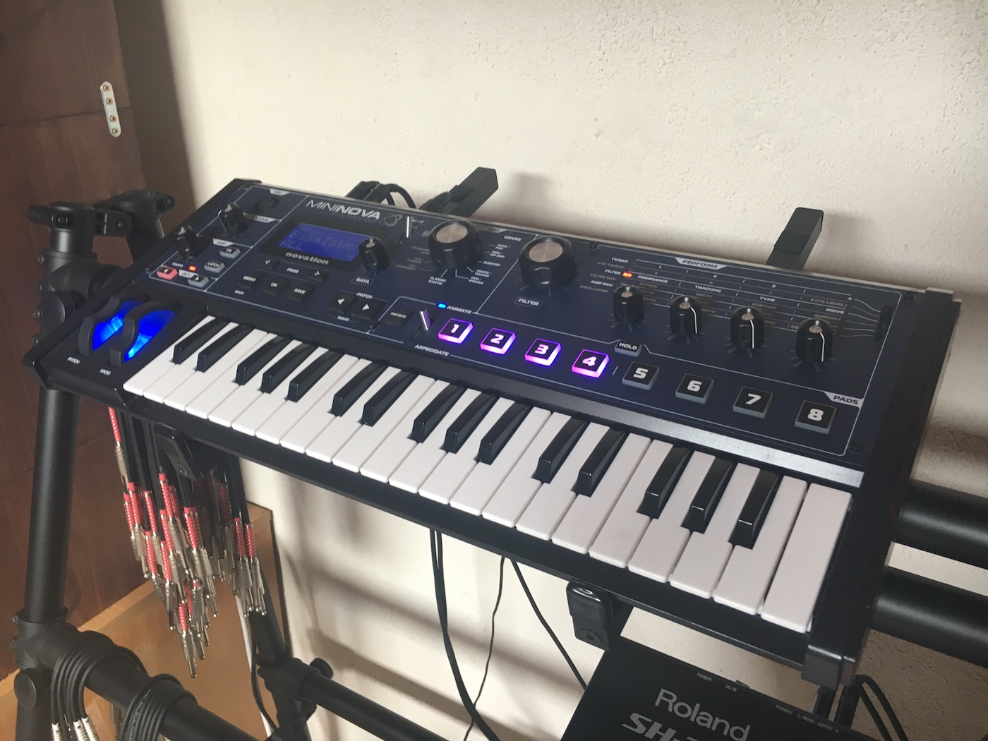 Après avoir fait l'acquisition d'un synthétiseur analogique, j'ai voulu avoir un synthétiseur numérique : j'ai donc choisi le Mininova. Le Mininova est le digne successeur de la lignée des "Nova" de chez Novation et est dôté d'un microphone avec une chaine de traitement associée. L'édition des sons se fait en passant par des menus et sous-menus, ce qui est assez long. Néanmoins, l'avantage de ce synthétiseur est qu'il possède en façade quatres potentiomètres (avec un interrupteur permettant de se servir des potentiomètres à différents endroits) qui peuvent servir en direct (lors de lives par exemple) à régler certains paramètres (dont 7 assignables librement). Comme la plupart des synthétiseurs numériques, l'avantage est que les sons sont sauvegardables.