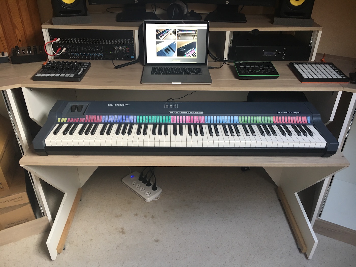 Afin de pouvoir contrôler les synthétiseurs Expander en ma possession, j'utilise un grand clavier maitre (88 touches) dôté d'un toucher lourd et de mécaniques à marteau : ceci arrive assez bien à transmettre la sensation ressenti lorsque l'on joue sur un vrai piano. Les autocollants présents sur les photos sont des références MIDI, ce qui me facilite la programmation lors de certains projets.
